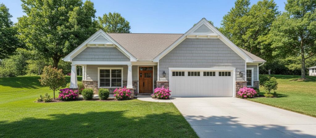 The exterior showcases durable finishes, classic architectural lines, and a two-car garage — combining beauty with long-lasting quality craftsmanship.
